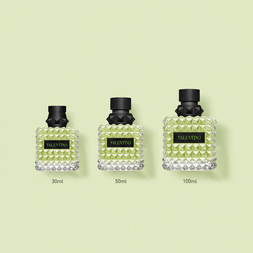 O frasco de Valentino Born In Roma Donna Green Stravaganza é uma verdadeira obra de arte, refletindo o equilíbrio entre tradição e modernidade que define a Maison Valentino.