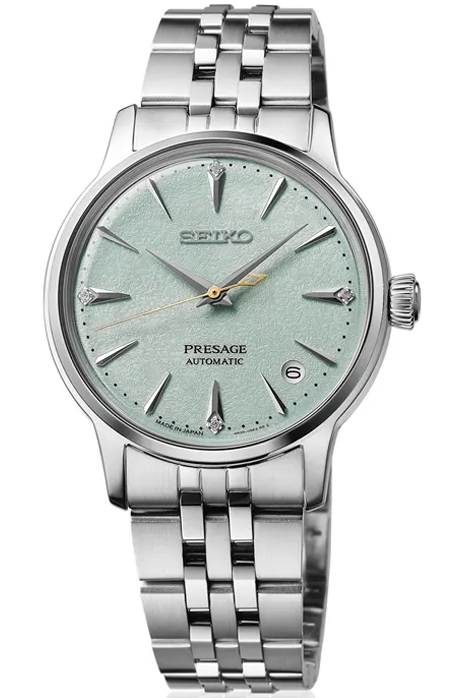 O modelo SRPL63 “Diamond Frozen Mojito” é inspirado no célebre coquetel Mojito, trazendo para o pulso frescor, textura e luminosidade em cada detalhe. Seu mostrador verde-claro texturizado remete ao gelo picado, evocando a sensação de um drink servido no auge da refrescância.