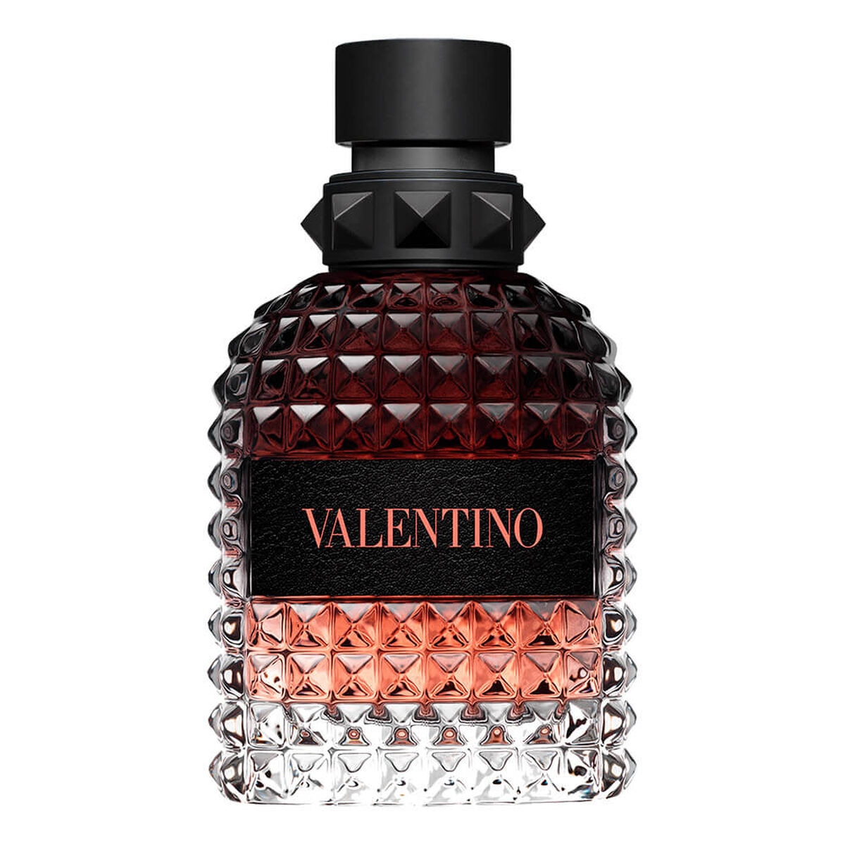 O frasco de Born In Roma Coral Fantasy Uomo apresenta o design clássico Rockstud inspirado nos rebites da alta costura Valentino e nas pedras dos palácios de Roma.