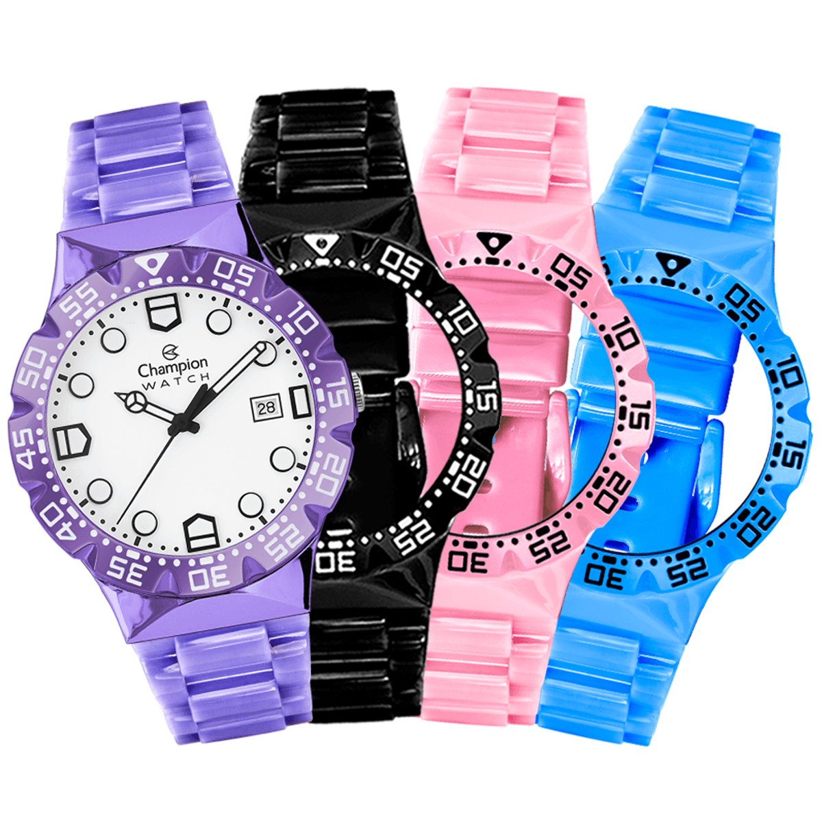 O Champion Troca Pulseiras vem com uma caixa metálica de 42mm e 4 pulseiras de plástico em cores incríveis, para você variar e combinar com qualquer look e ocasião.