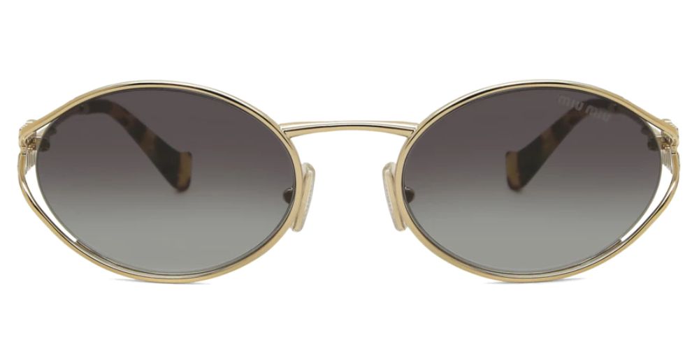 Óculos de sol Miu Miu SMU 52Y ZVN-80Q 54 com armação metálica dourada e lentes cinza escuro 54 mm, oferecendo proteção UV eficaz e estilo sofisticado. Um modelo unissex de luxo, perfeito para quem busca sunglasses Miu Miu, óculos de sol premium e acessório de moda com design italiano.