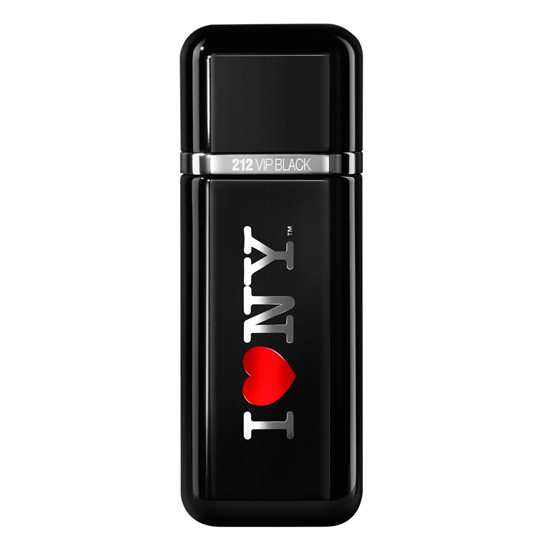 O frasco do 212 VIP Black I NY é preto brilhante com o icônico logo I NY