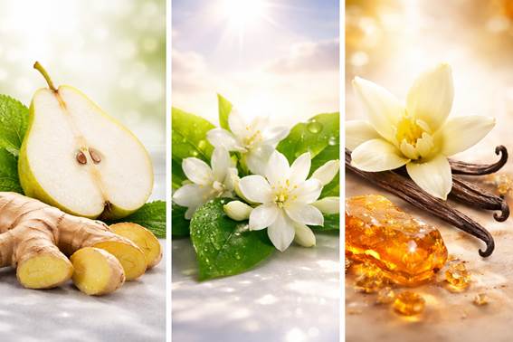 Uma fragrância frutal ambarada que se abre com uma sequência de notas cítricas vibrantes: pera suculenta realçada por gengibre e tangerina.