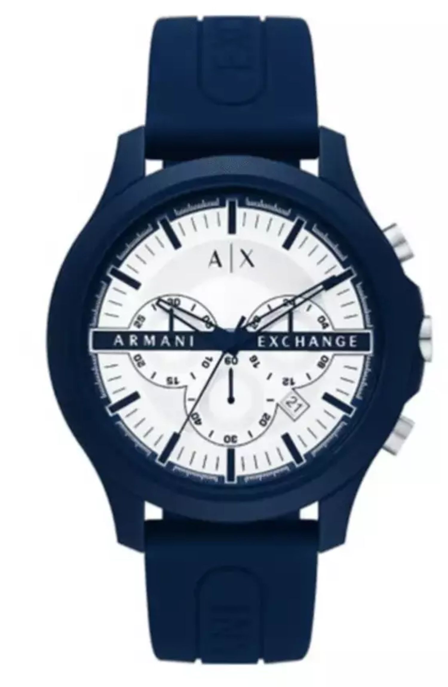Relógio Armani Exchange AX2437B1 B1DX unissex com caixa em aço inoxidável e pulseira de borracha, combinando conforto e estilo urbano. Mostrador analógico com cronógrafo e calendário, mecanismo quartz preciso e resistência à água 5 ATM (50 m), ideal para uso diário com visual moderno e versátil.