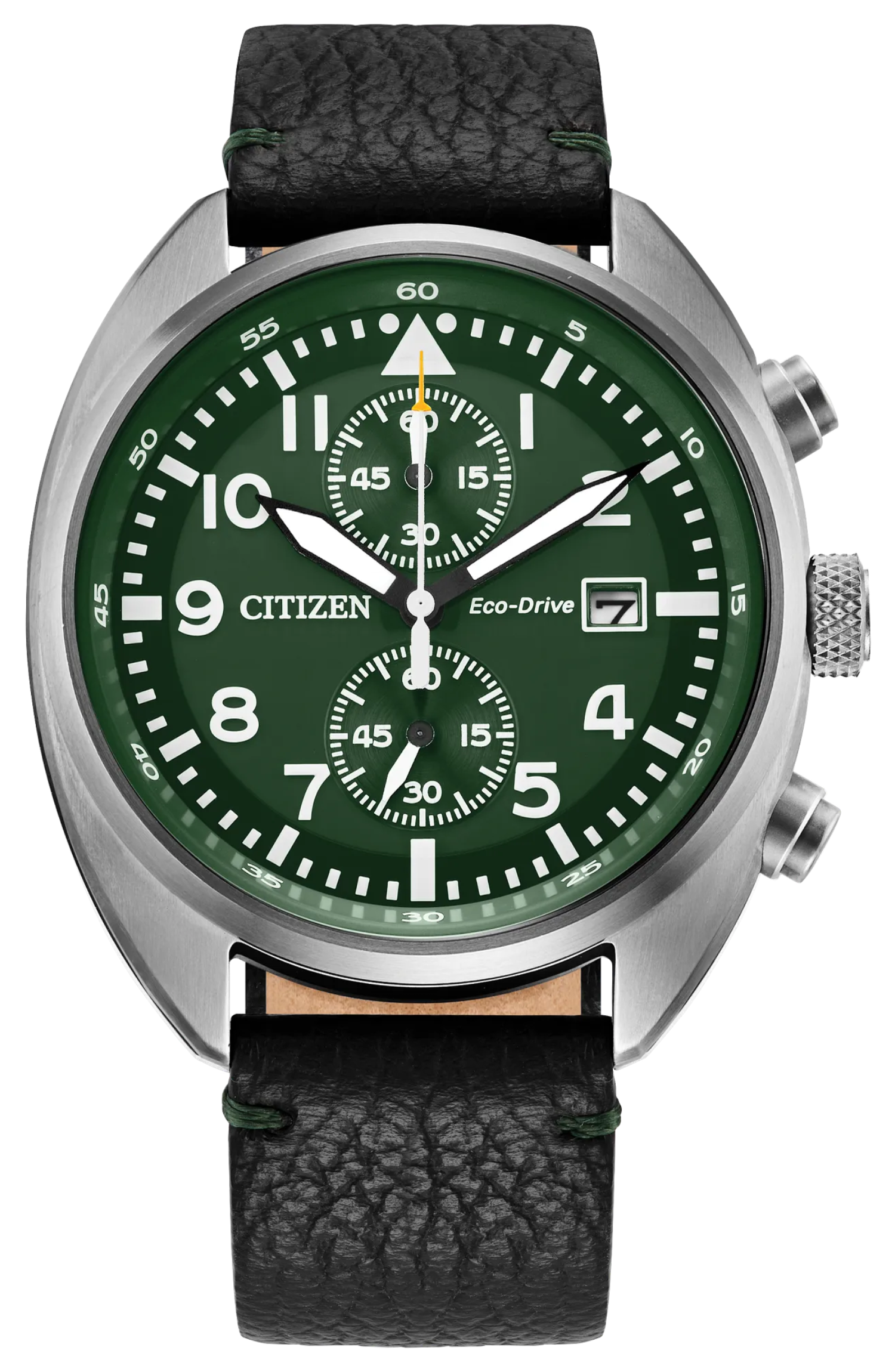 Mostre sua versatilidade com o novo cronógrafo Sport Casual: caixa de aço inoxidável prateado de 41 mm com botões modernos e coroa canelada, acabamento esportivo e pulseira de couro verde. O mostrador verde militar com detalhes contrastantes inclui cronógrafo e janela de data às 3 h. Alimentado pela tecnologia Eco-Drive, funciona com qualquer luz e dispensa troca de bateria. Resistente à água até 100 m.