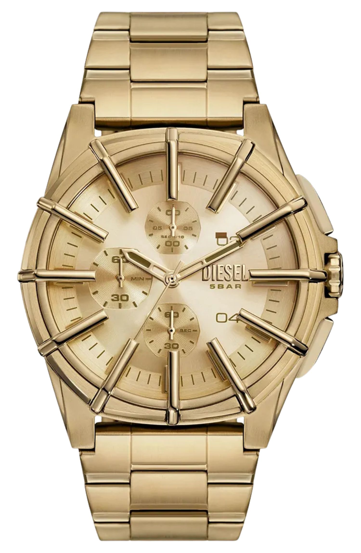 Relógio original Diesel com design sofisticado em aço inox dourado e mostrador analógico com funções de cronógrafo e calendário. Esse modelo combina robustez e estilo urbano, perfeito para complementar looks do dia a dia ou ocasiões especiais.