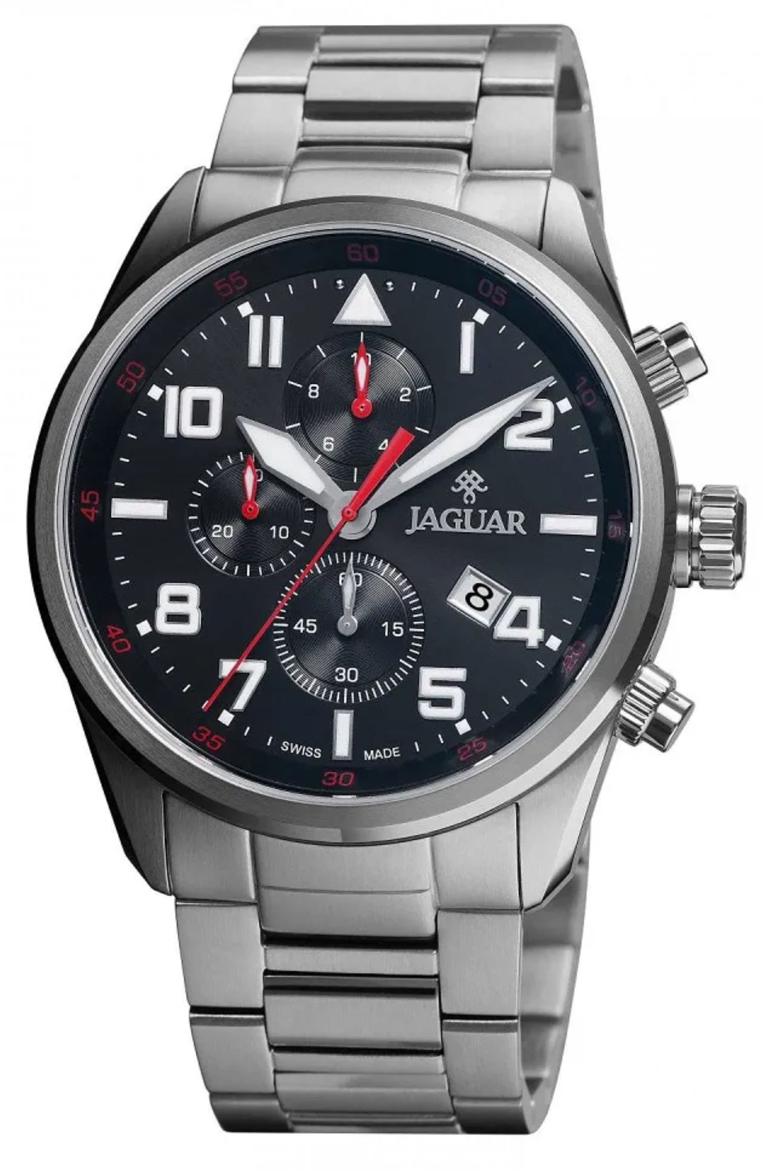 Relógio masculino Jaguar com design elegante em aço inoxidável e mostrador preto, ideal para uso diário ou ocasiões especiais. Possui cronógrafo e calendário, visor em cristal de safira resistente a riscos e movimento quartz de alta precisão.