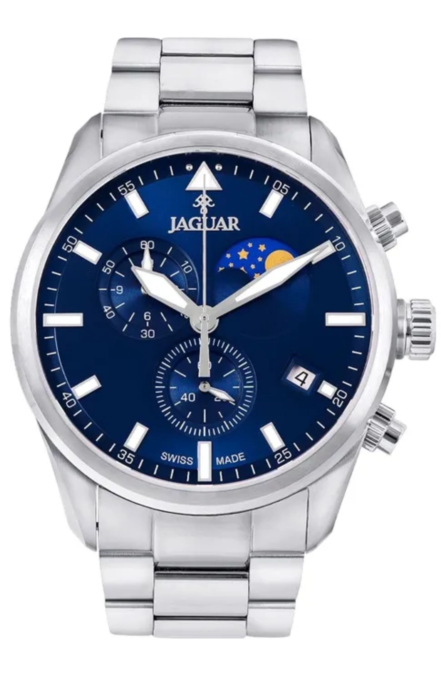 Relógio Jaguar masculino J03CDSS01 D1SX com caixa e pulseira em aço inoxidável, mostrador azul elegante e visor em cristal de safira, oferecendo resistência a riscos e uso diário. Equipado com movimento quartz confiável, função de calendário e ponteiro de segundos independente, é ideal para complementar looks casuais ou formais com estilo e precisão.