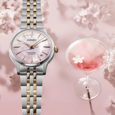 Relógio feminino de edição limitada, com apenas 9.000 peças no mundo, trazendo exclusividade e alto valor de coleção — sendo o exemplar da A JOIA o número 5055. Inspirado no coquetel “Sakura Aviation”, remete à delicadeza das flores de cerejeira na primavera, traduzindo elegância em cada detalhe.