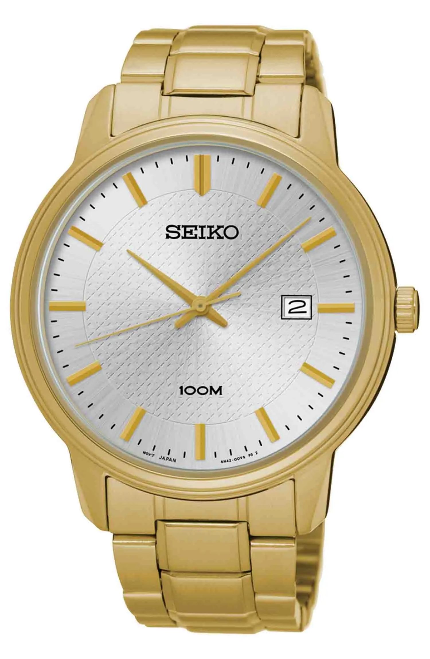 Relógio masculino SEIKO com design clássico e sofisticado, ideal para o dia a dia ou ocasiões especiais. Possui caixa e pulseira em aço inoxidável dourado, mostrador branco com calendário de data e movimento quartzo Seiko (Calibre 6N42) de alta precisão. Vidro em cristal mineral HARDLEX resistente e resistência à água de até 100 m, combinando estilo e funcionalidade com durabilidade.