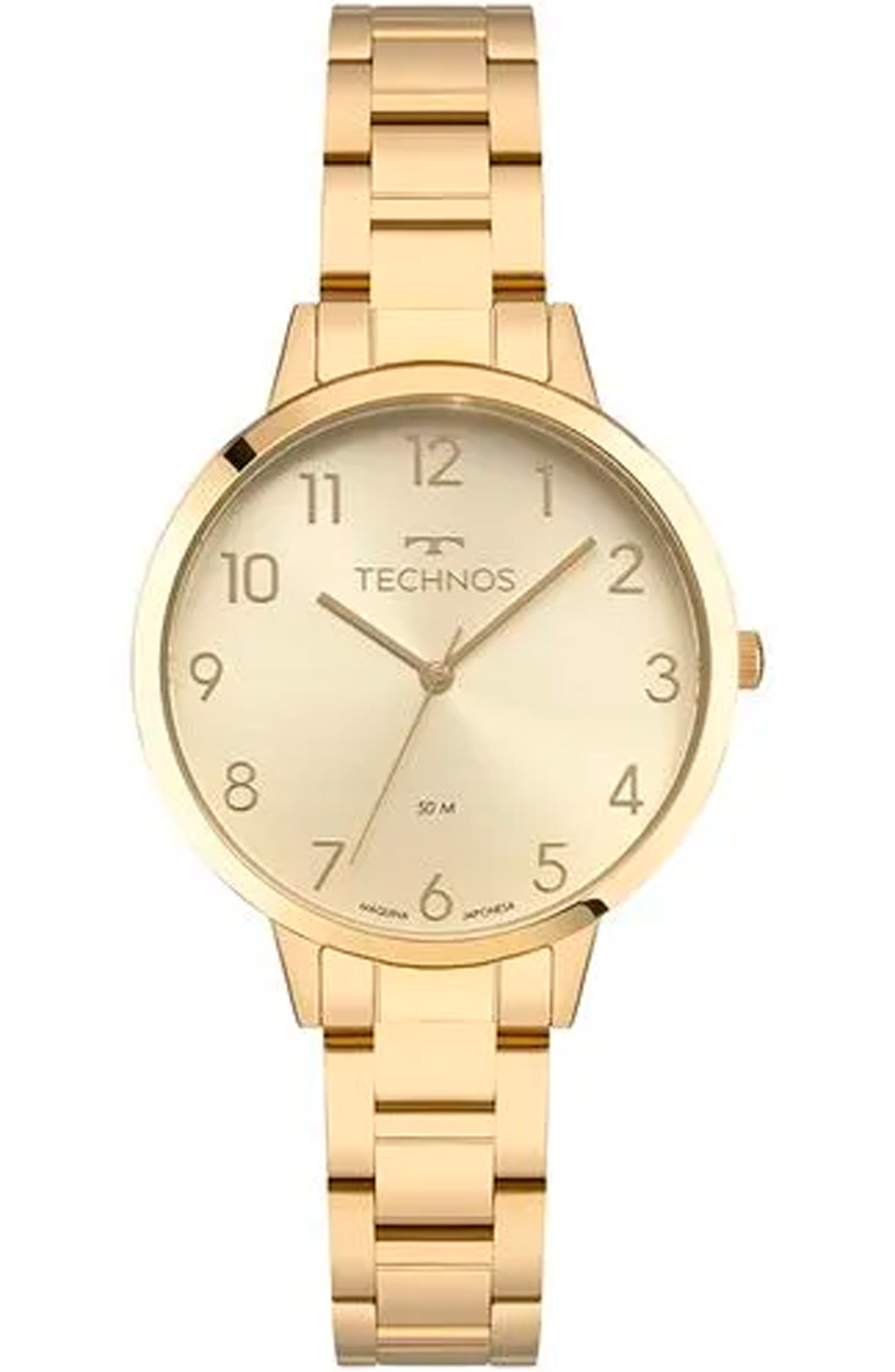 O Relógio Technos Feminino Dress Dourado é um elegante relógio feminino com design clássico e sofisticado, ideal para ocasiões do dia a dia ou eventos especiais. Possui, mostrador champagne de fácil leitura e pulseira de aço inoxidável dourada com acabamento refinado. Seu movimento analógico a quartzo garante precisão, e a resistência à água de 5 ATM (50 m) oferece praticidade no uso diário.
