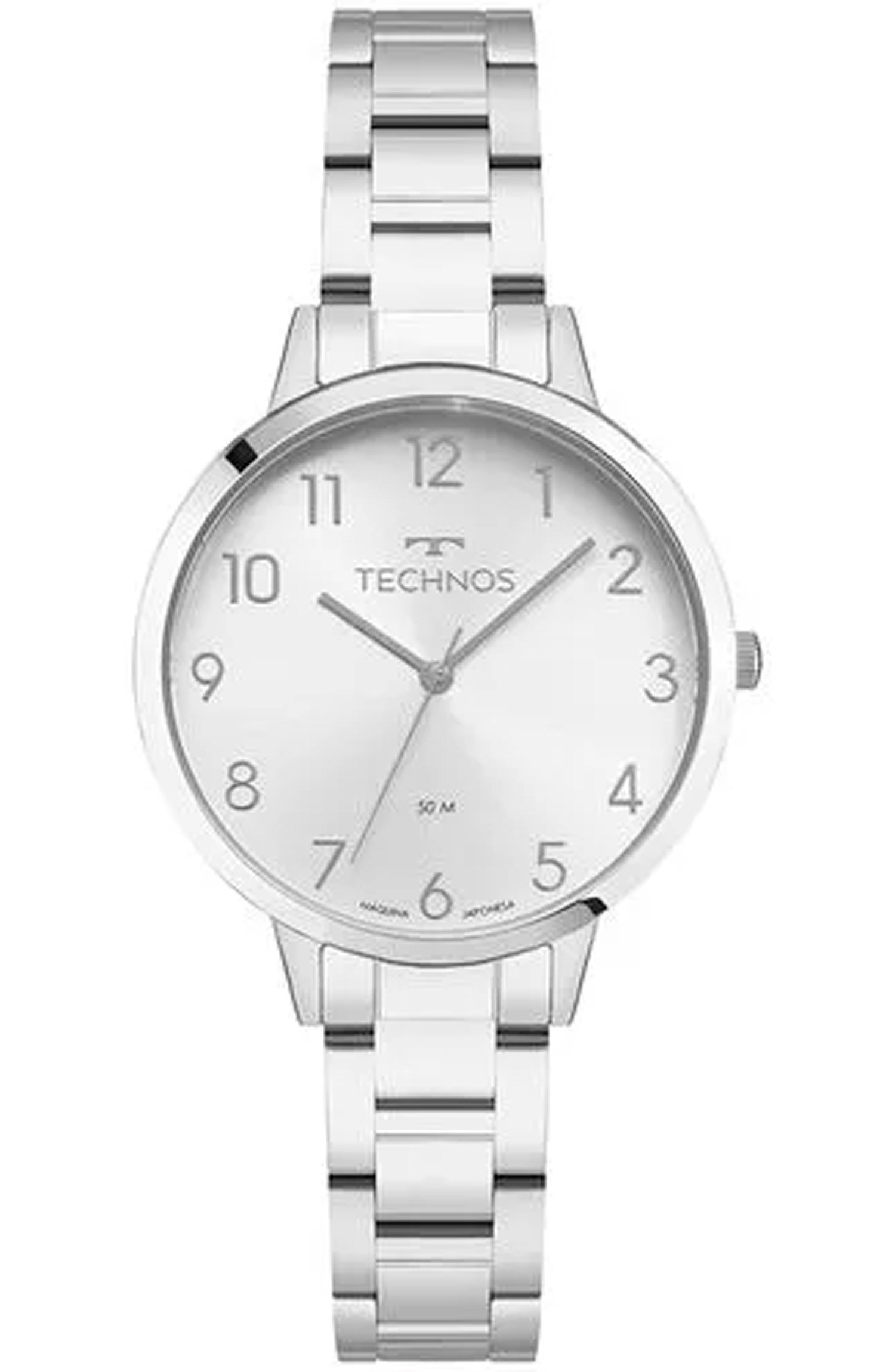 Relógio feminino Technos Dress 2035NDN/1K com design elegante em aço inox prata, mostrador prateado de fácil leitura com numeração arábica e pulseira em três links. Movimento analógico quartz confiável e resistência à água de 5 ATM (50 m), perfeito para uso diário com estilo clássico e versátil.